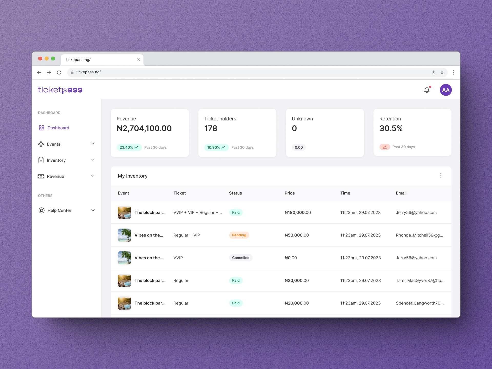 A comprehensive dashboard tailored for creators, encompassing features such as event management, inventory tracking, and revenue insights.